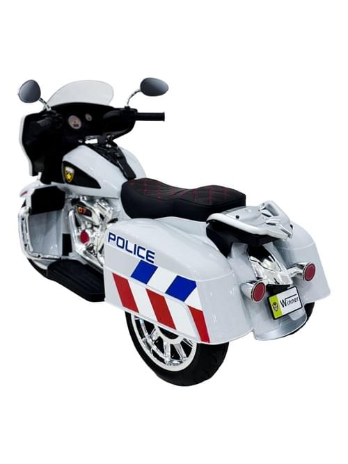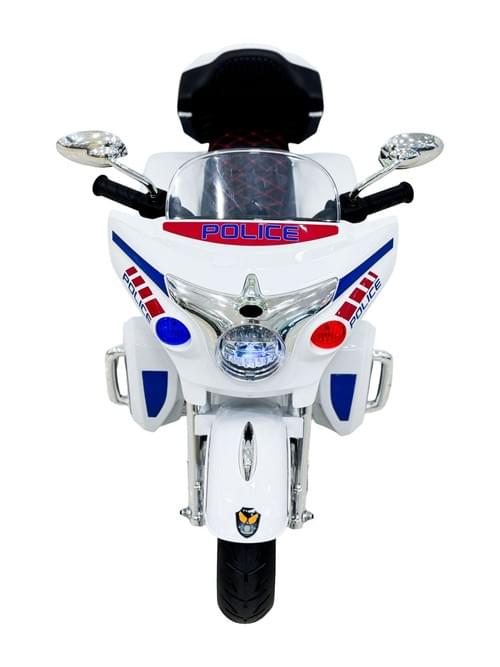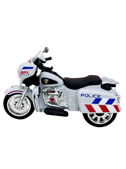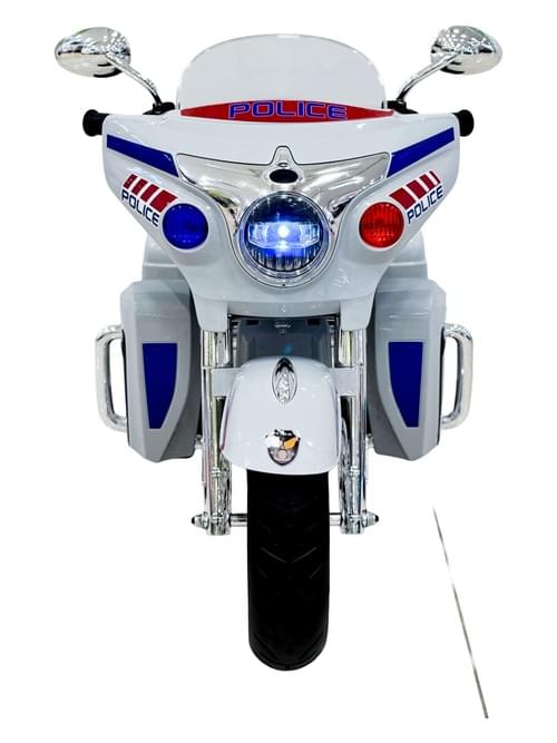 Kids electric motorcycle, white, three-wheeled sport motorcycle, battery powered, with windshield and lights.