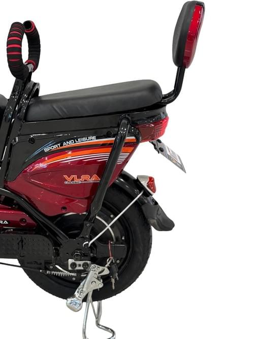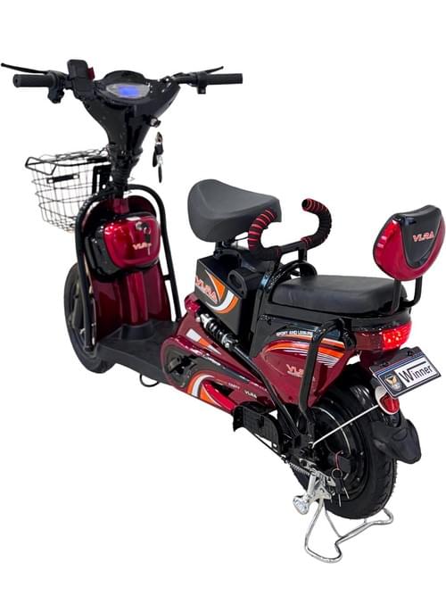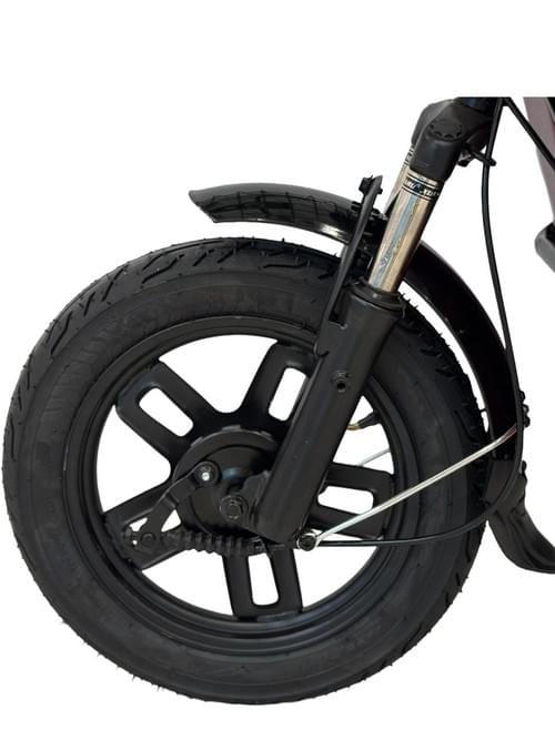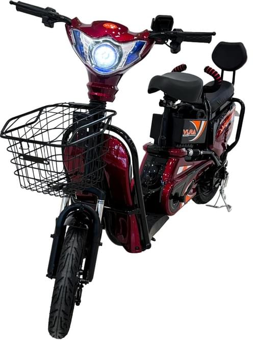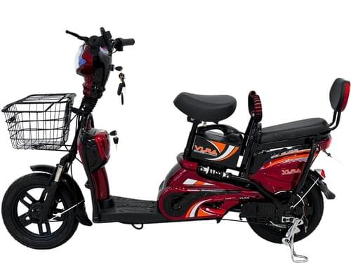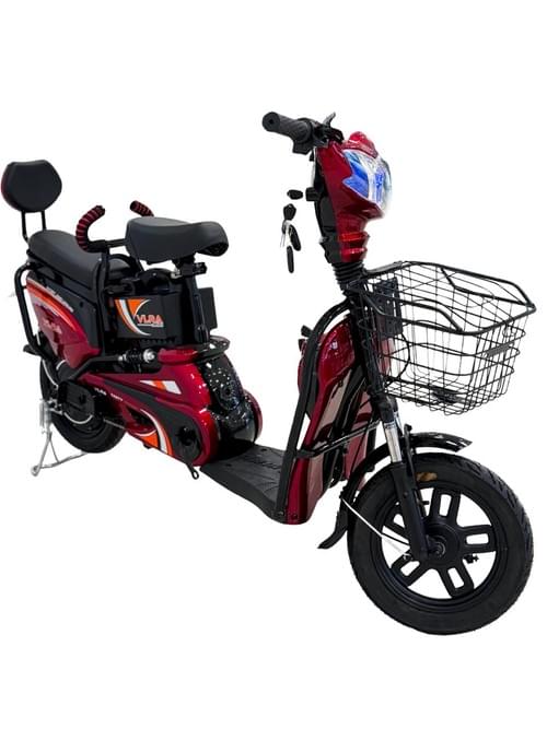 Electric mobility scooter with front storage basket, LED headlights, double seat, shock absorption system, 14-inch tires, and 48V 12AH battery.