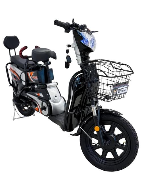Electric mobility scooter with front storage basket, LED headlights, double seat, shock absorption system, 16-inch tires, and 48V 12AH battery.