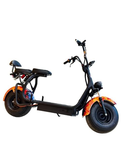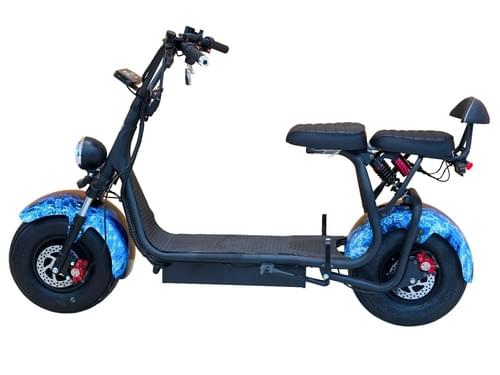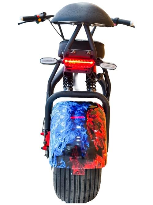VLRA 60V12AH lead-acid battery, electric Harley, equipped with LED headlights, wide tires, custom blue flame pattern, disc brakes and 60-speed derailleur.
